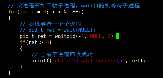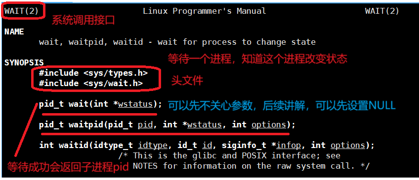 - pid=-1,等待任意一个子进程,与wait效果相同