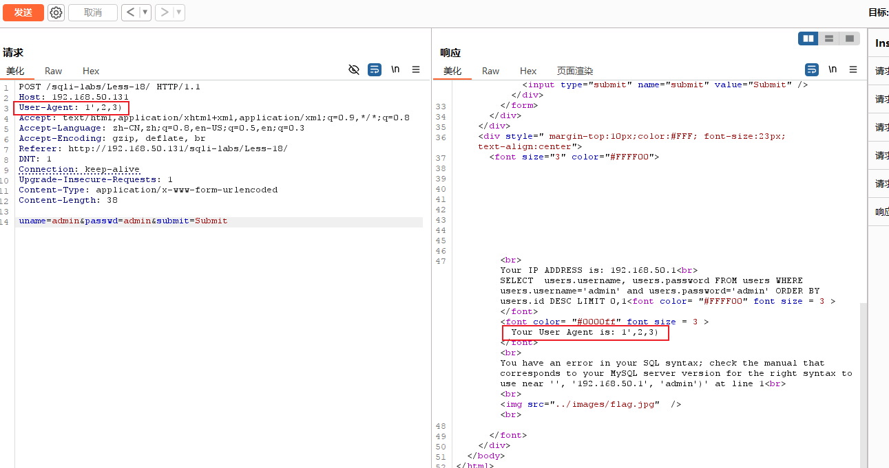 当前关卡注入点在头部,可以使用bp抓包后修改头部信息,然后再发起请求