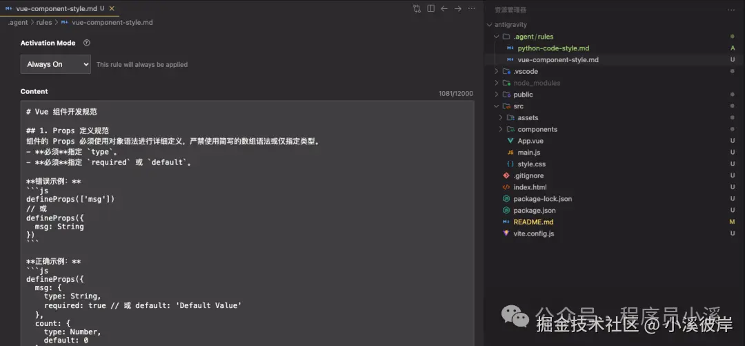 最后填写 描述 和 提示词 内容后保存,保存后项目提示词规则会存放到 工作区/.agent/rules 目录下