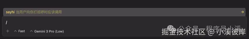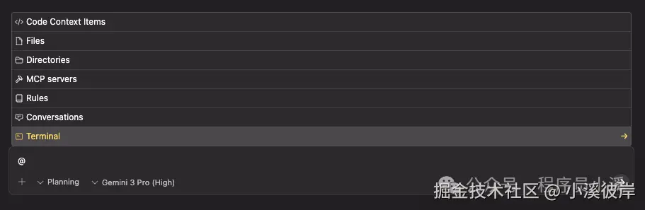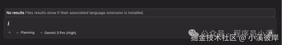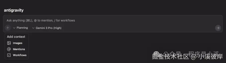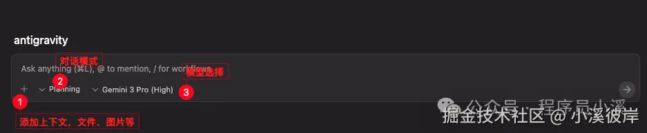 Antigravity的聊天窗口还是比较简单的,和传统的对话窗口一样包含 上下文添加、对话模式选择 和 模型切换