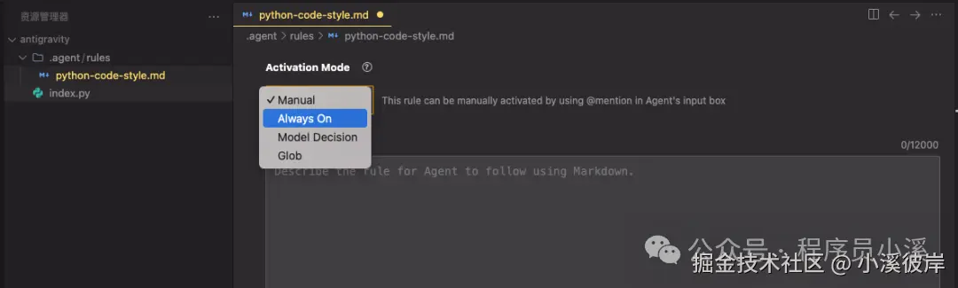 配置规则触发时机,看着和Cursor操作一致,对Cursor配置感兴趣的小伙伴可以看往期内容:【Cursor】Cursor中的Project Rules是什么?