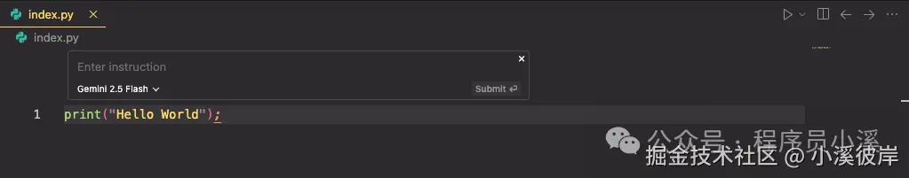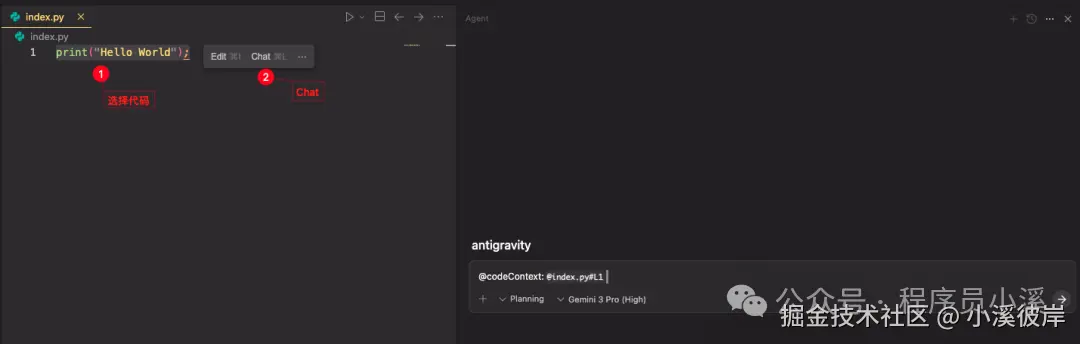 Antigravity同样支持内联对话,内联对话适合单文件的代码编辑,在文件编辑器中直接使用 Ctrl/Cmd+I 快捷键即可唤起内联对话窗口