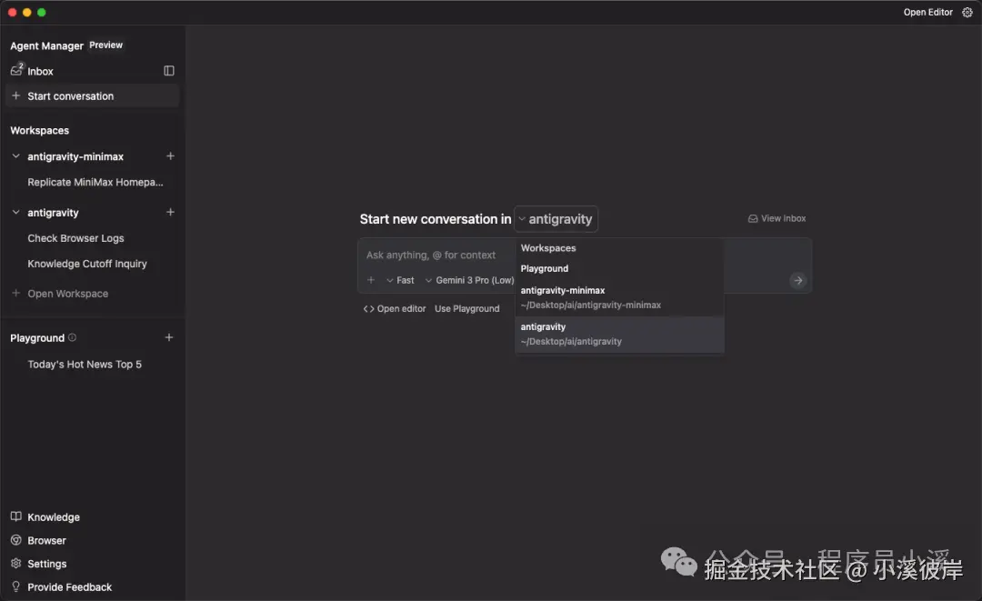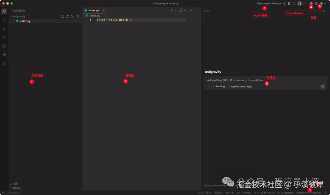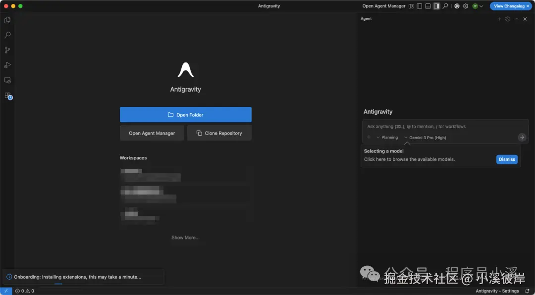 Antigravity IDE是基于VS Code魔改版(懂得都懂),使用过VS Code的小伙伴可以无缝衔接。当前Antigravity也提供了 Agent Manager、Open Brower、Antigravity Settings 等个性化功能