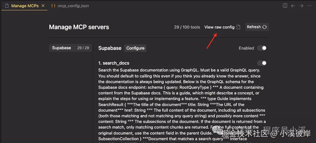 如果MCP市场没有所需的MCP服务,可以点击【View raw config】打开MCP JSON配置文件进行配置