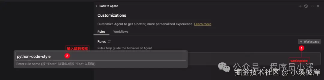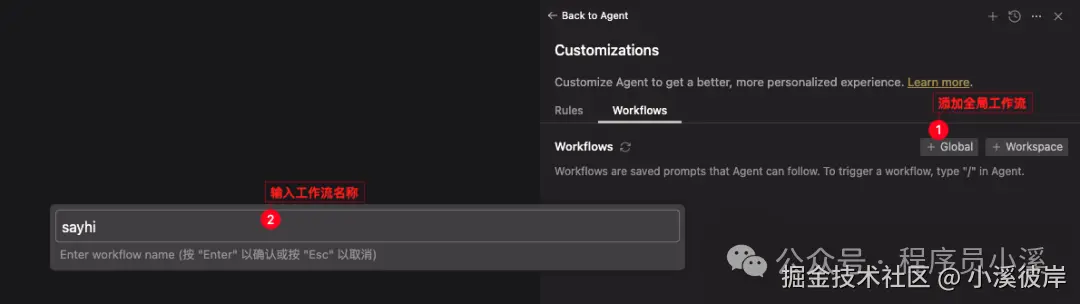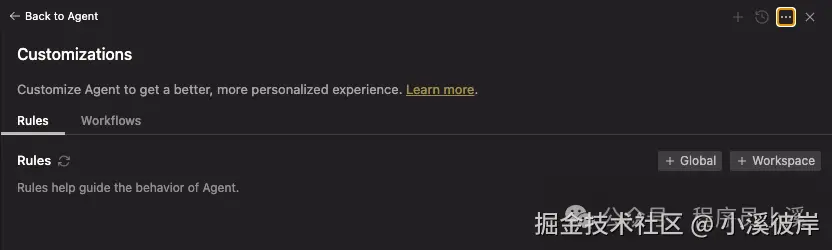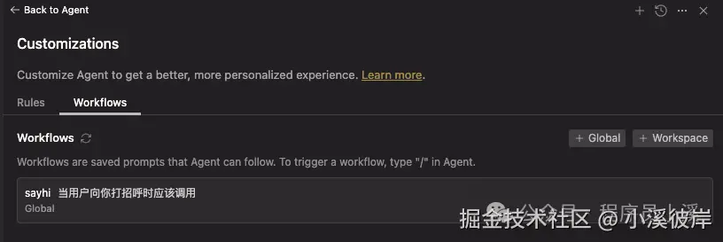 在Customizations配置界面选择【Workflows】进入工作流配置界面,Antigravity的工作流其实就相当于Claude Code中的自定义命令,工作流配置也支持 Global(全局)和 Workspace(项目)2种配置