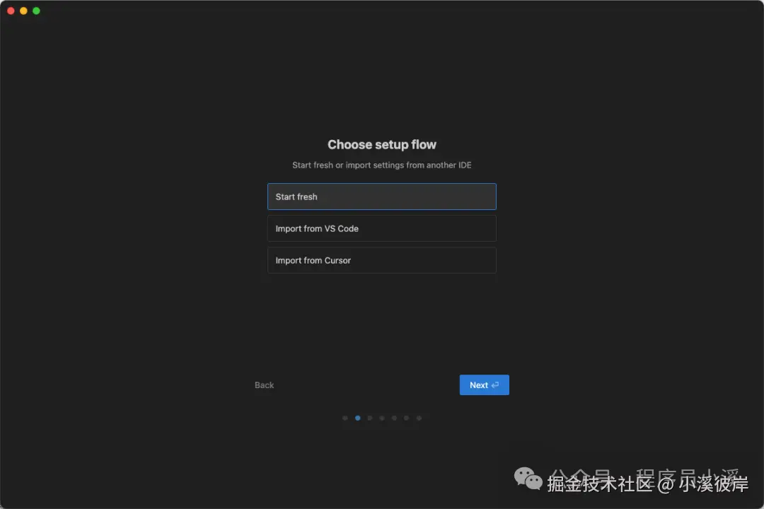 点击【Next】继续,可以选择【Start fresh】继续,也可以选择从VS Code或者Cursor导入插件(据说当前版本导入有问题)