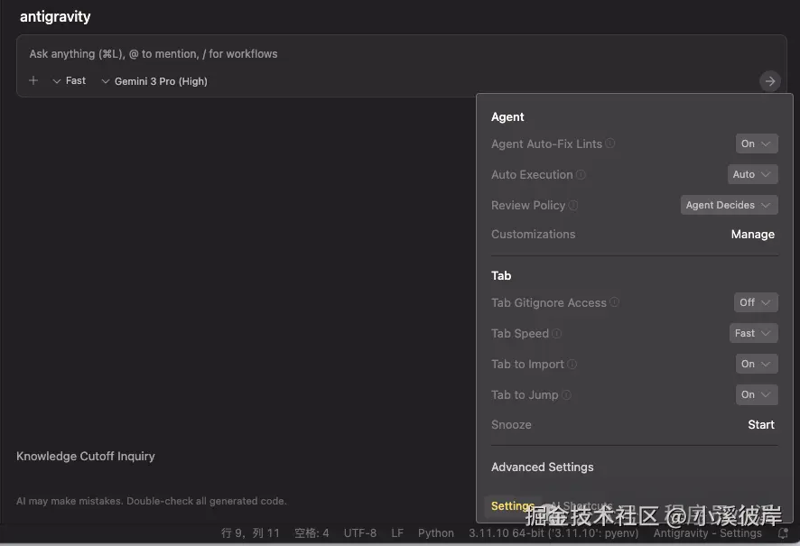 在编辑器右下角,点击【Antigravity-Settings 】可以快速开关 Agent 和 Tab 设置