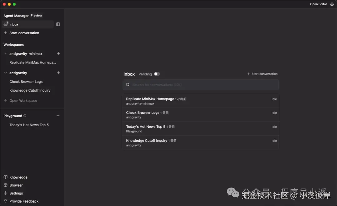 Antigravity的后台任务其实就是创建了一个临时工作区,所有后台任务在临时工作区内完成,点击Agent Manager右上角的【Open Editor】可以打开临时工作区