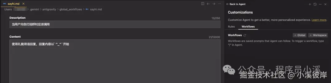 点击【Global】,输入工作流名称和提示词内容后保存,可以看到全局工作流保存在 ~/.gemini/antigravity/global_workflows 目录下