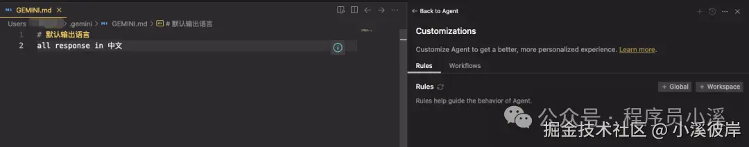 点击【Global】可以添加全局提示词规则,创建完成后可以看到路径为:~/.gemini/GEMINI.md,居然和Gemini CLI是共用的