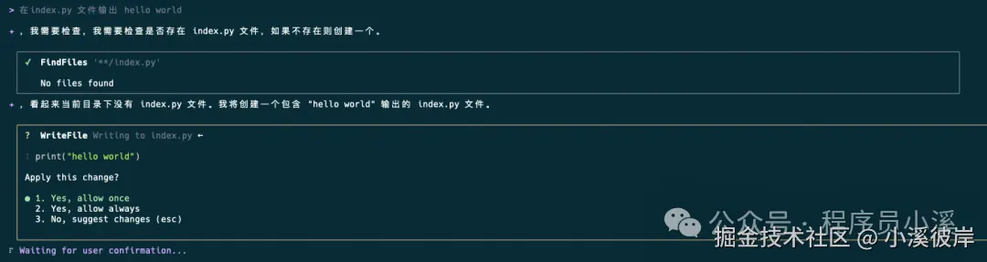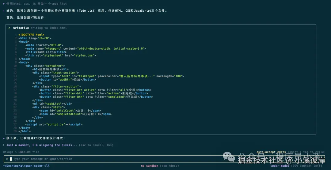当我们切换到【auto-accept edits】模式时,再次执行同一个任务时,Qwen Code CLI会直接进行文件编辑任务