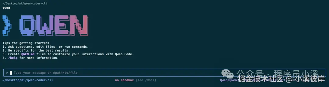 Qwen Code CLI安装完成后,在命令行终端输入 qwen 启动CLI,启动后界面如下: