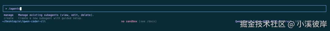 Qwen Code CLI支持子代理功能,在交互式命令中输入 /agents 可以查看Agents菜单