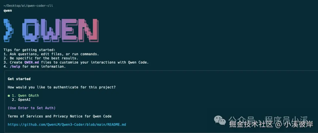 可以看到操作界面和Gemini CLI基本是一样的,区别是模型换成了coder-model,登录方式有 Qwen OAuth 和 OpenAI 两种授权方式: