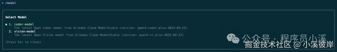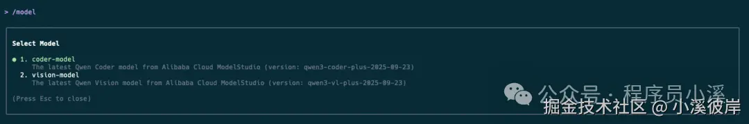 使用【Qwen OAuth】方式授权,在交互式命令中调用 /model命令可以看到除了 coder-model 模型,还提供了一个 vision-model 视觉模型