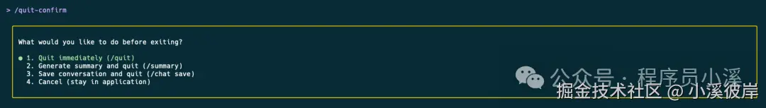 Qwen Code CLI新增的交互式命令,用于退出 Qwen Code 前显示确认对话框,允许你选择如何处理当前会话。