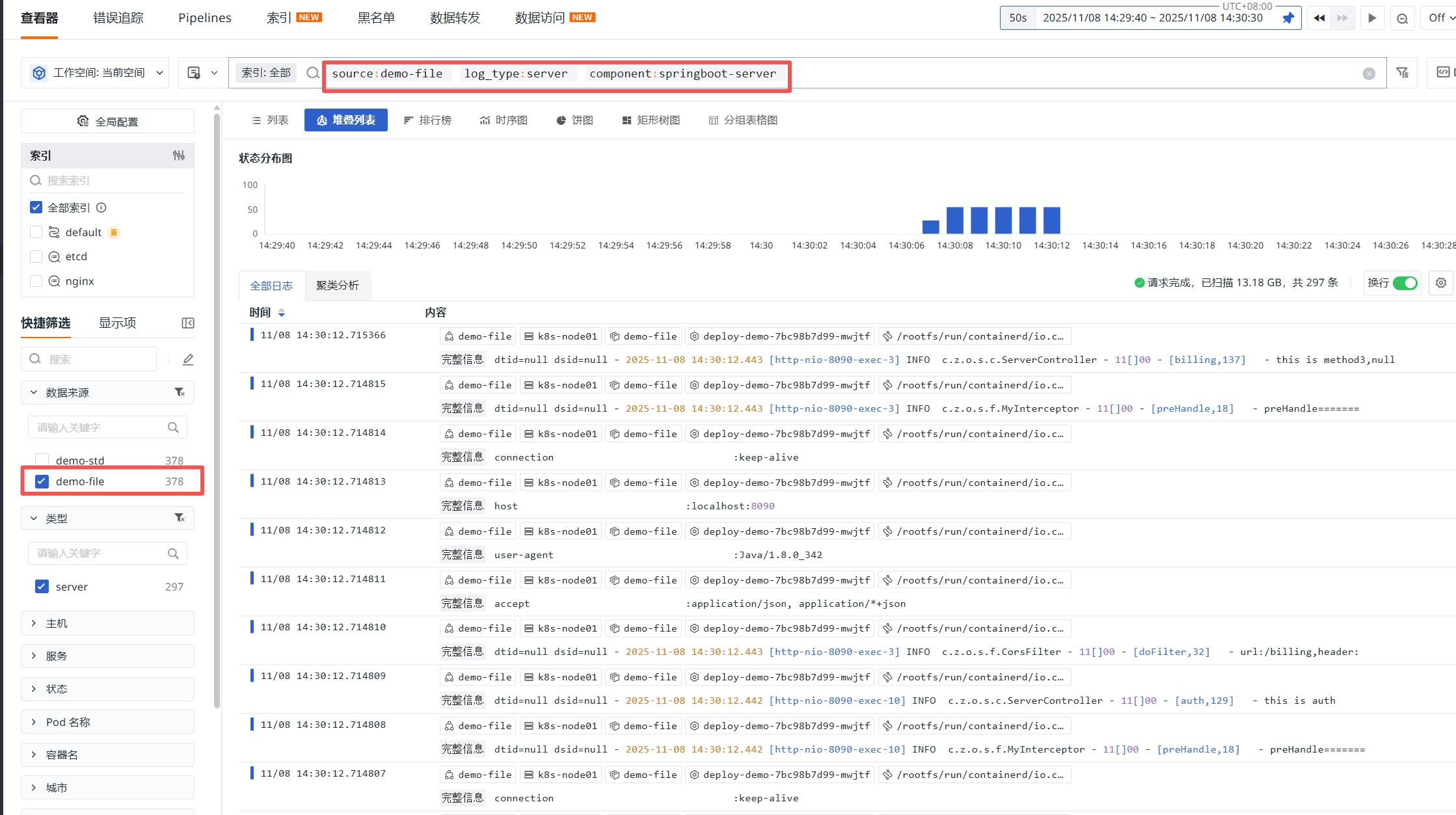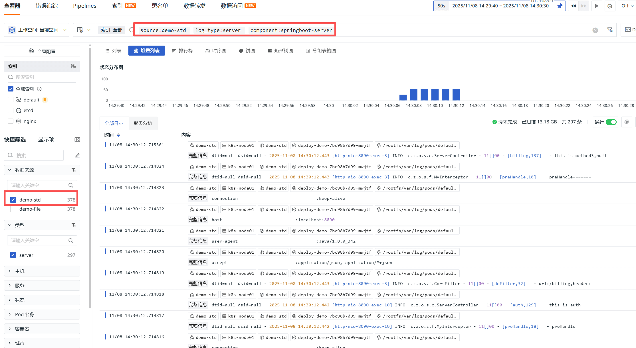 podLabelSelector: "app=demo"podTargetLabels: - app - version - enviroment configs: - source: "demo-file" type: "file" path: "/data/logs/server/server.log" tags: log_type: "server" component: "springboot-server" - source: "demo-std" type: "stdout" disable: false tags: log_type: "server" component: "springboot-server" -