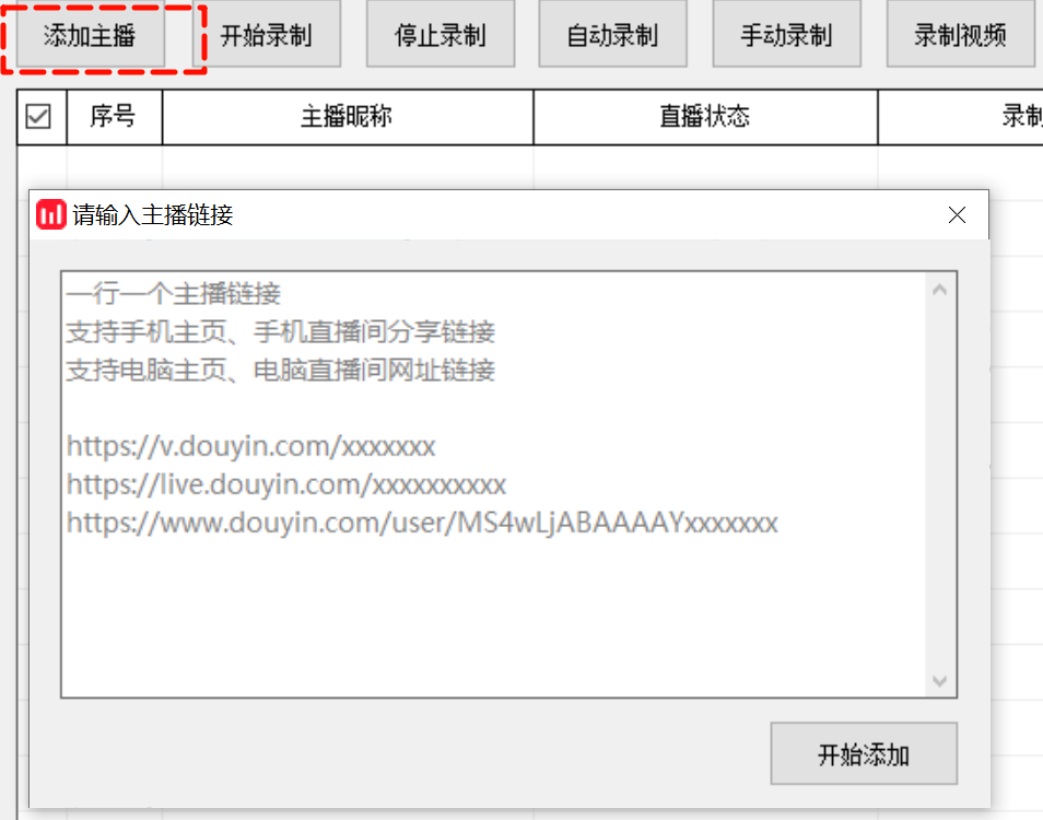 然后添加直播间的网址,也可以多个直播间一起录制。