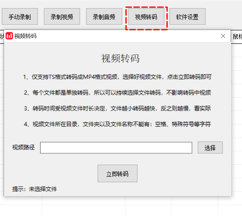 如果录制的视频格式不对,也可以使用软件自带的视频转码功能。