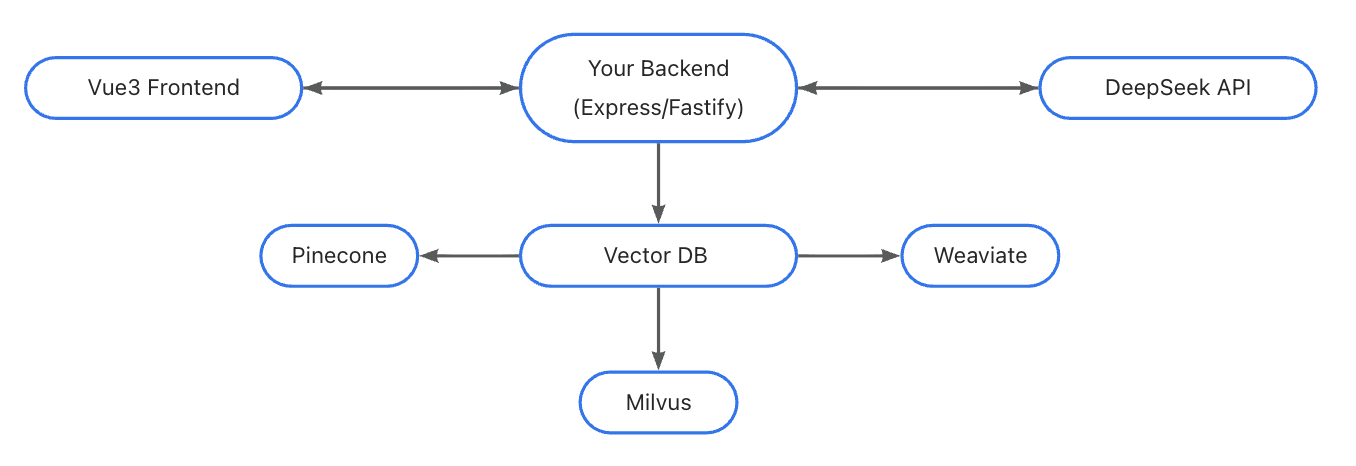 - 后端负责:API key 保管、调用 DeepSeek(LLM/Embeddings/Vision)、管理向量 DB(建库/检索)、会话管理(可选)。