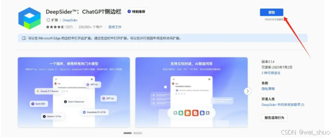 以Edge浏览器为例,进入插件安装页面后,点击获取按钮,就可以安装DeepSider插件了。