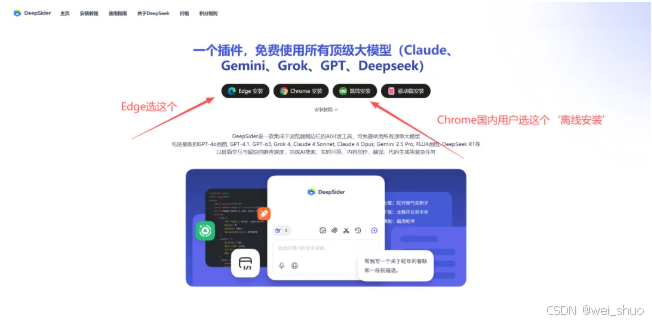 方法很简单,打开DeepSider官网,根据你的浏览器版本找到安装入口(Chrome可选择离线安装)。