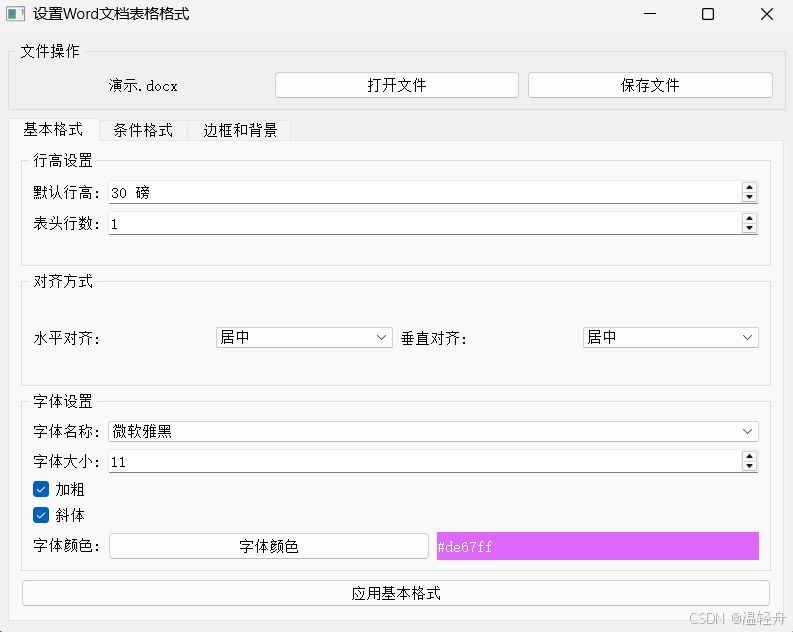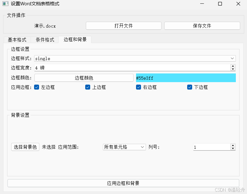 PyQt5和python-docx库开发的图形化应用程序,用于对Word文档中的表格进行格式化设置。用户可以通过直观的界面调整表格的各种格式属性,包括基本格式、条件格式、边框和背景等