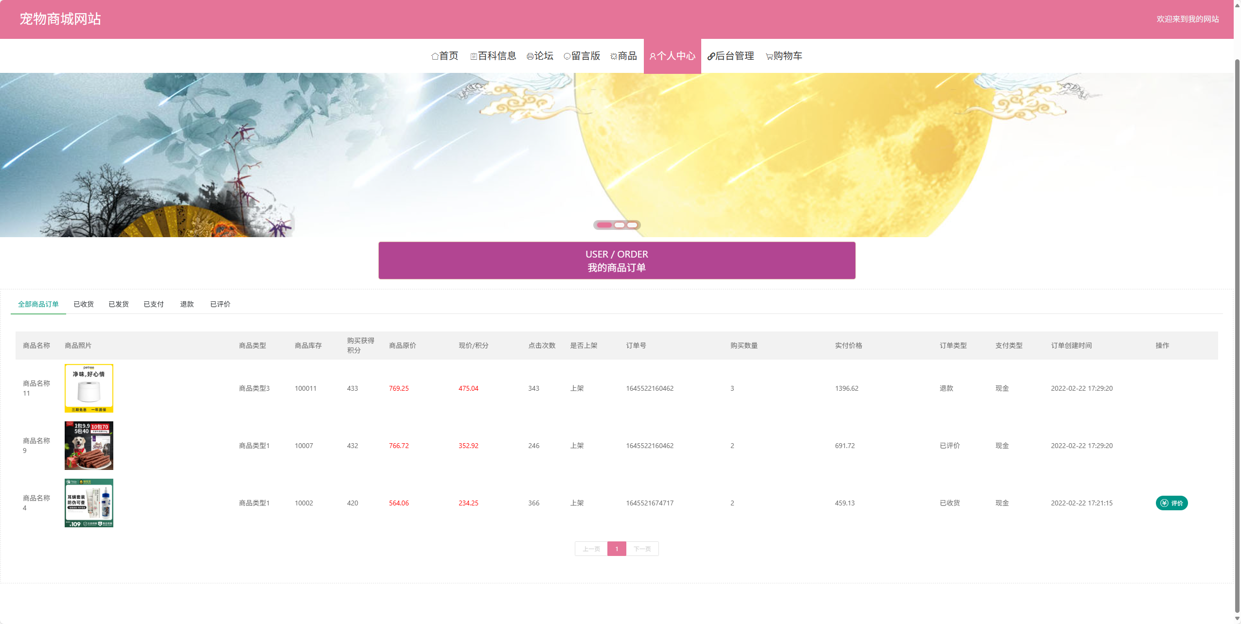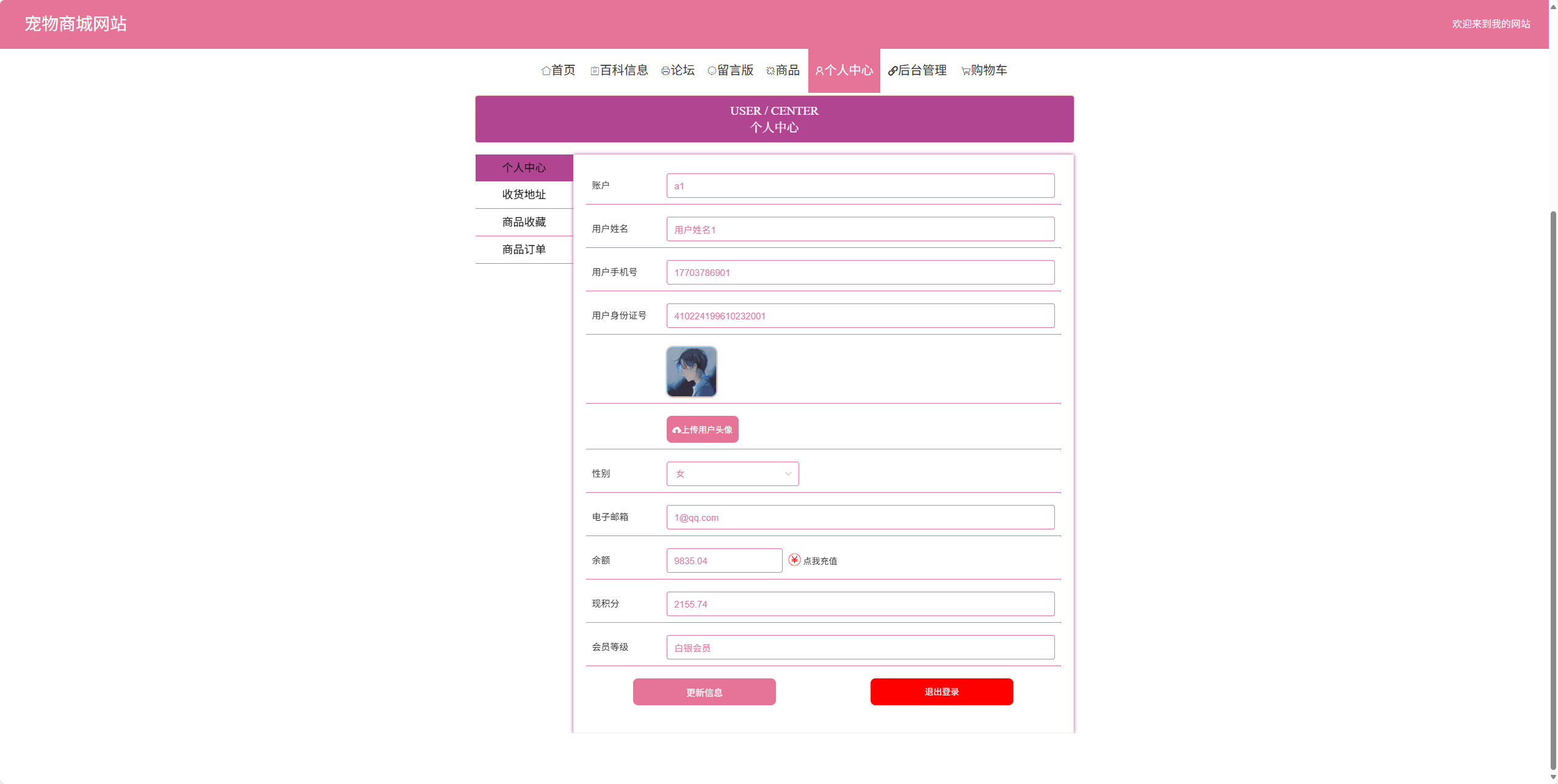 | 用户功能 | 个人中心:个人中心、收获地址、商品收藏、商品订单 |