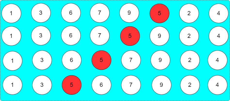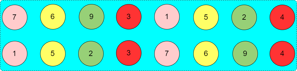 第一轮:数组长度/2 = 4,4个间隔元素进行大小比较和交换
