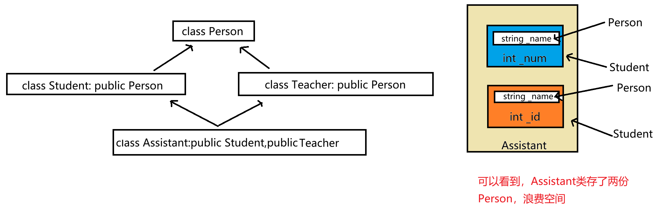 数据冗余:Assistant继承了两个Person副本,原目的只需要继承一份即可。