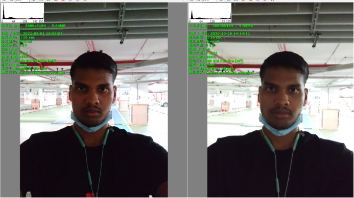 从下图可以看到车库背光场景调试机的人脸亮度比对比机稍暗,同时可以看到调试机的背景高光压制的比对比机好,这种情况下有两种方法优化:1.通过调整ADRC达到人脸亮度的提亮。2. 可以通过调整人脸的权重来提高人脸亮度。