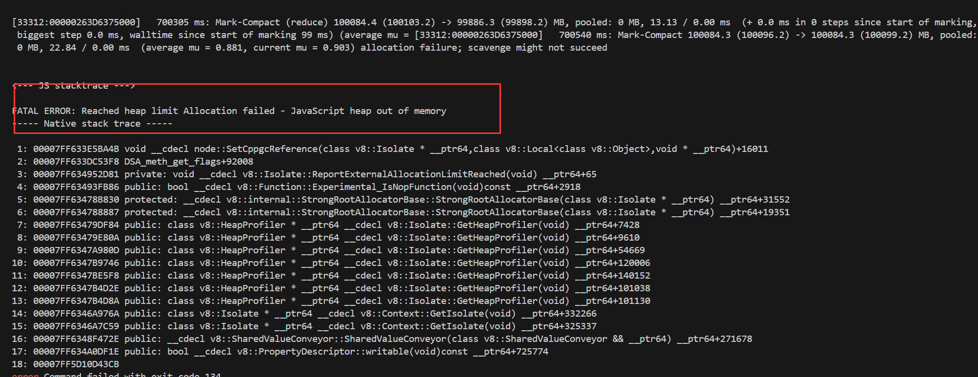 今天前端工程打包,突然一直出现内存溢出,也不报明显的代码错误,昨天及以前一直是正常的,