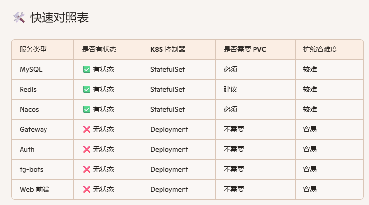 无状态服务:业务逻辑、网关、前端 → 用 Deployment,轻松扩缩容。