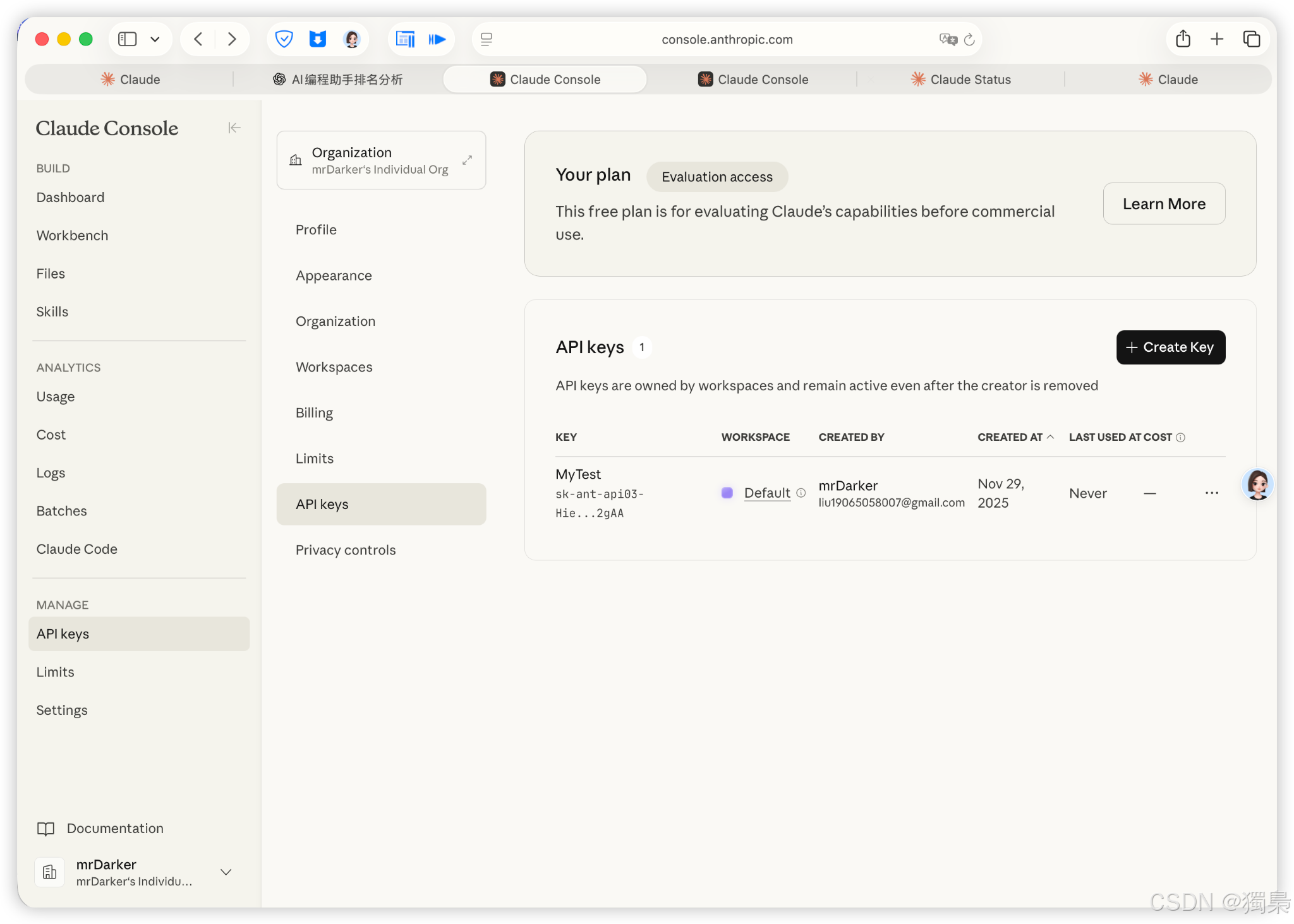 方式 B:使用 API Key 登录(适合免费 Evaluation 用户)