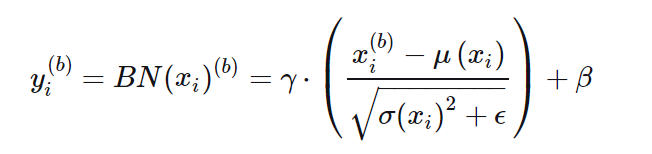 其中,x(b)i表示输入当前batch的b-th样本时该层i-th输入节点的值,xi为[x(1)i,x(2)i,...,x(m)i]构成的行向量,长度为batch size m,μ和σ为该行的均值和标准差,ϵ为防止除零引入的极小量(可忽略),γ和β为该行的scale和shift参数,可知