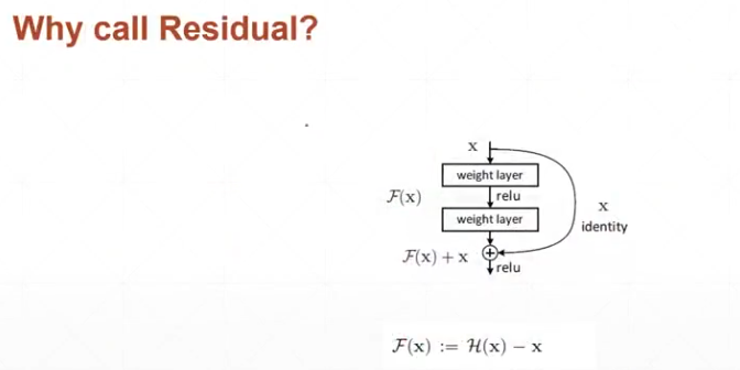 为什么叫做残差网络呢?其实原本我们所学习到的函数映射为y=F(x),即我们希望F(x)能够学习到数据x的特征,保证其恒等映射,但是我们现在变成了y=F(x)+x,从而变成了y-x=F(x),我们所学习的F(x)变成了这样的形式,我们去学习数据x的特征容易还是去让F(x)趋向于0更容易,当然很显而易见了。所以残差网络为什么叫残差的原因就是体现在这里。