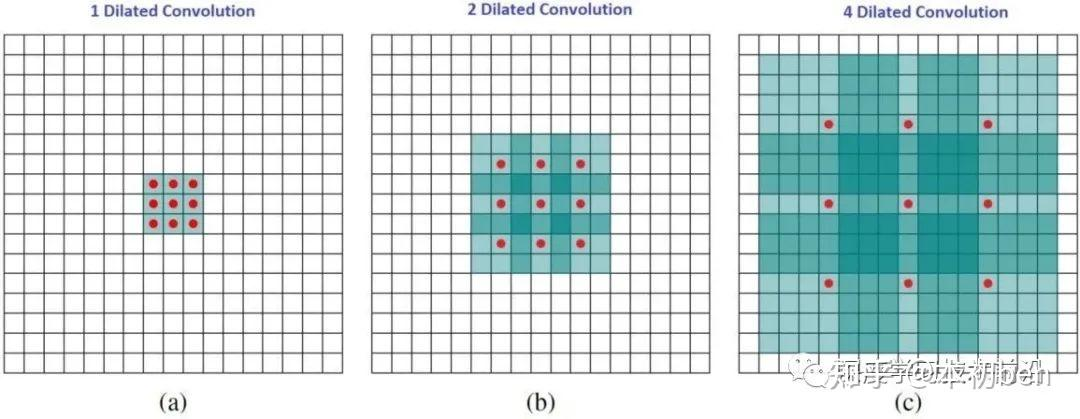 这里面有个扩张率(dilation rate)的系数,这个系数定义了这个间隔的大小,标准卷积相当于dilation rate为1的空洞卷积。dilation rate为1、2、4的时候卷积核感受野如下图所示: