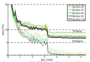 为了解决深层网络中的退化问题,可以采取一种策略,即让神经网络的某些层跳过与下一层神经元的直接连接,实现隔层相连,从而减弱每层之间的紧密联系。ResNet论文中提出的残差结构(residual结构)正是为了缓解这一问题。如下图所示,采用了残差结构的卷积网络在层数不断增加的情况下,性能并没有下降,反而有所提升。(图中虚线表示训练误差,实线表示测试误差)