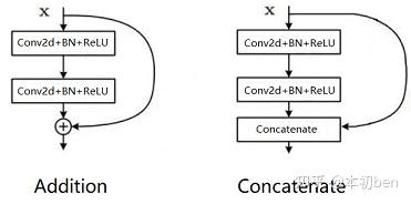 Addition和Concatenate分支操作统称为shortcut,如下图所示,操作极为简单。Addition是在ResNet中提出,两个相同维度的feature map相同位置点的值直接相加,得到新的相同维度feature map,这个操作可以融合之前的特征,增加信息的表达,Concatenate操作是在Inception中首次使用,被DenseNet发扬光大,和addition不同的是,它只要求两个feature map的HW相同,通道数可以不同,然后两个feature map在通道上直接拼接,得到一个更大的feature map,它保留了一些原始的特征,增加了特征的数量,使得有效的信息流继续向后传递。