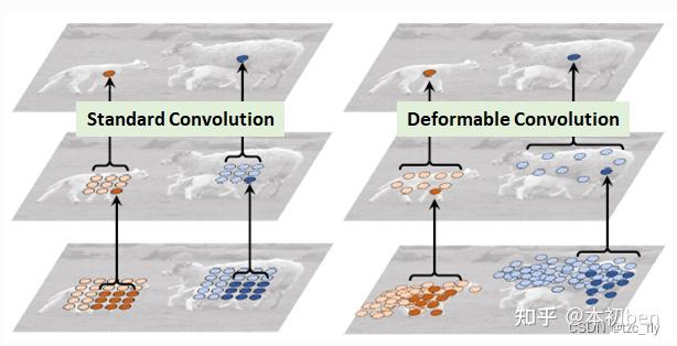 在上面这张图里面,左边传统的卷积显然没有提取到完整绵羊的特征,而右边的可变形卷积则提取到了完整的不规则绵羊的特征。