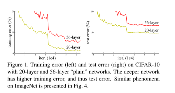 当时盛行的vgg网络,最多也就是到了19层,为什么不继续加深网络的结构呢?是不想吗,当然不是,按道理来说,当网络加深的时候,模型应该会表现的越来越好,能够学习到更多的特征呐,所以表现精度应该会更加优秀才对,但是实际上并不是,当网络加深的时候,表现反而不如浅层的原因,这是为什么呢?