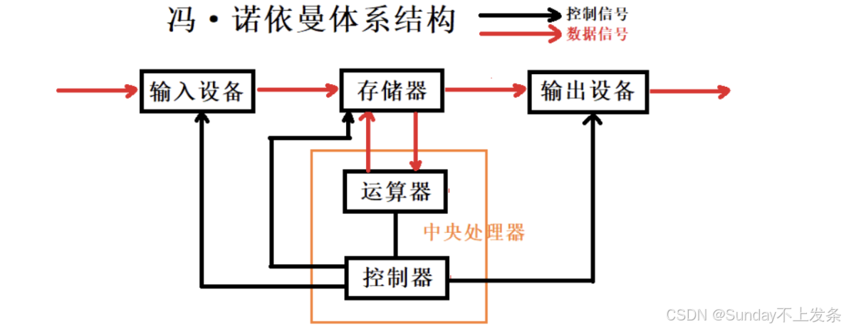 冯诺依曼体系结构规定计算机由运算器,控制器,存储器,输入设备和输出设备五大部件组成: