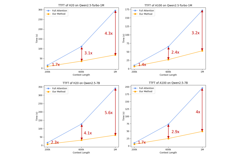 图 3:Qwen2.5-Turbo 和 Qwen2.5-7B 在完全注意力机制和我们的方法下的 TTFT(首次标记到达时间)