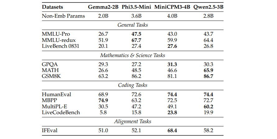 其他指令调优模型。如表8所示,Qwen2.5-7B-Instruct 模型在除 IFEval 外的所有任务中显著超过其竞争对手 Gemma2-9B-IT 和 Llama3.1-8B-Instruct。值得注意的是,Qwen2.5-7B-Instruct 在数学(MATH: 75.5)和编程(HumanEval: 84.8)任务中展现出明显优势。对于边缘端指令调优模型,尽管 Qwen2.5-3B-Instruct 模型的参数少于 Phi3.5-mini-instruct(Abdin et al., 2024)和 MiniCPM3-4B-Instruct(Hu et al., 2024)模型,但在数学和编程任务中超越了它们,如表9所示。此外,它在语言理解方面也表现出竞争力的结果。Qwen2.5-1.5B-Instruct 和 Qwen2.5-0.5B-Instruct 模型相比于其前代版本也有了显著的性能提升,具体详情见表10。这些提升使得它们特别适合在资源极为受限的环境中进行边缘端应用。