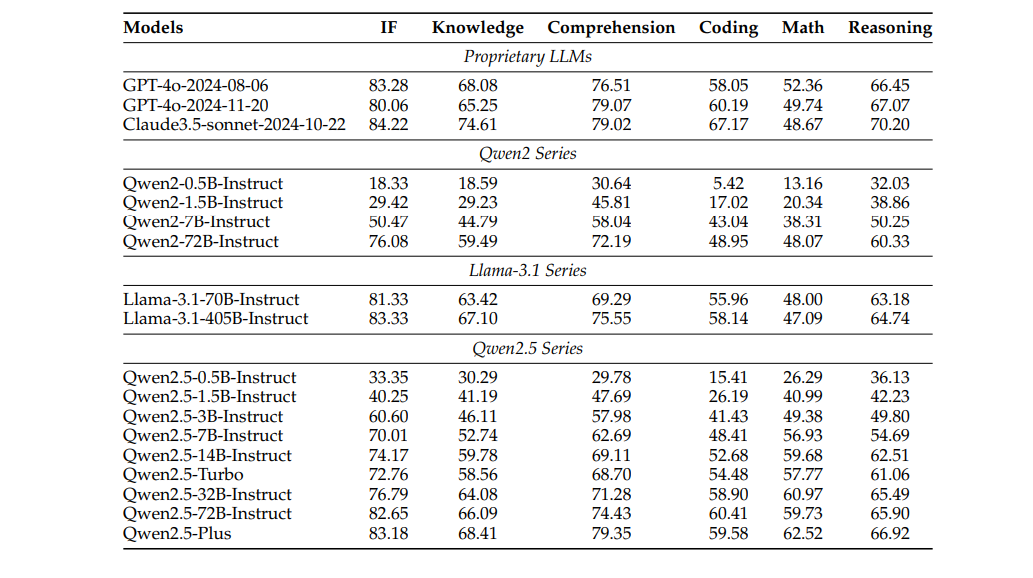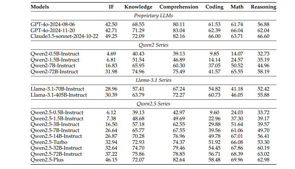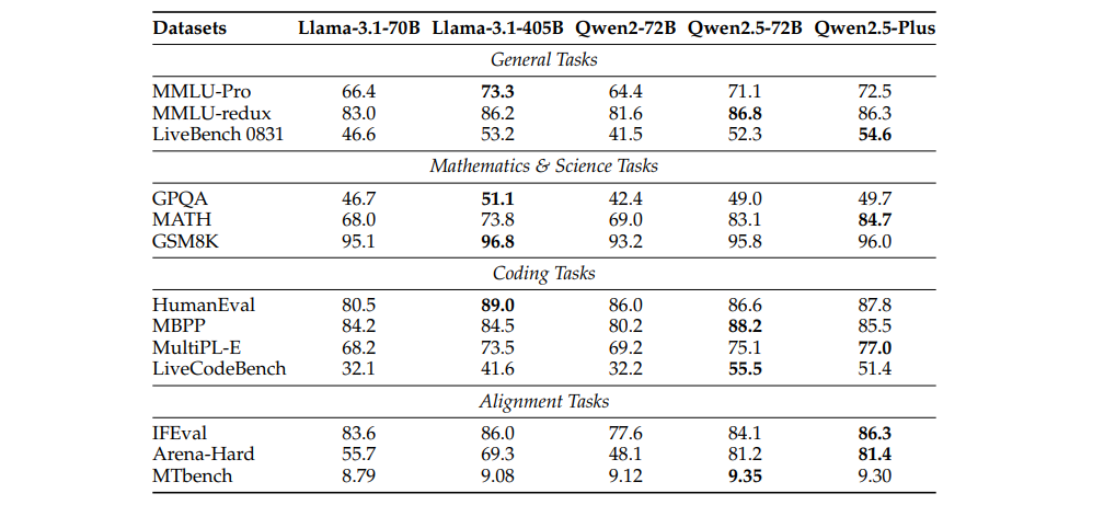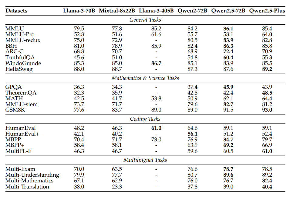 表 2:70B+基础型号和 Qwen2.5-Plus 的性能