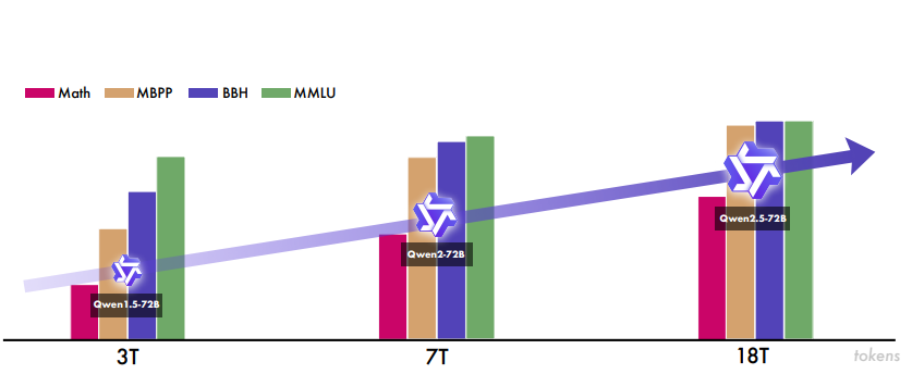 1 更大的训练数据规模 :相较于之前版本(例如 Qwen2),Qwen2.5 在预训练阶段将高质量语料规模从约 7 万亿 tokens 扩展到 18 万亿 tokens。这种大数据量为模型提供了更坚实的常识、专业知识与推理基础。