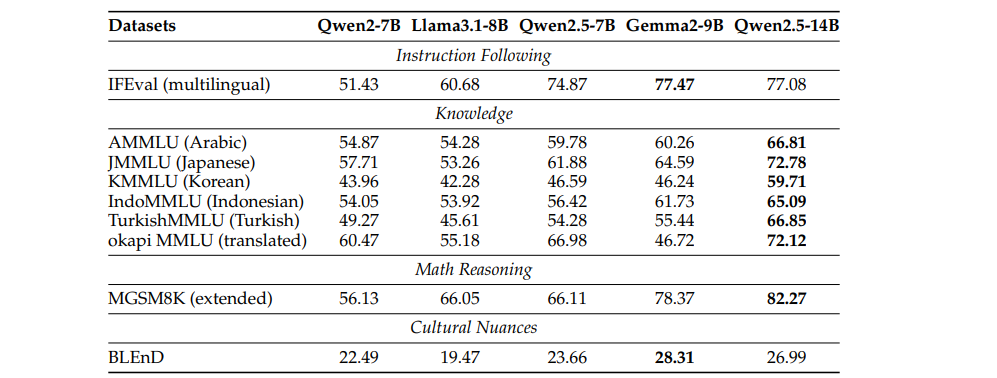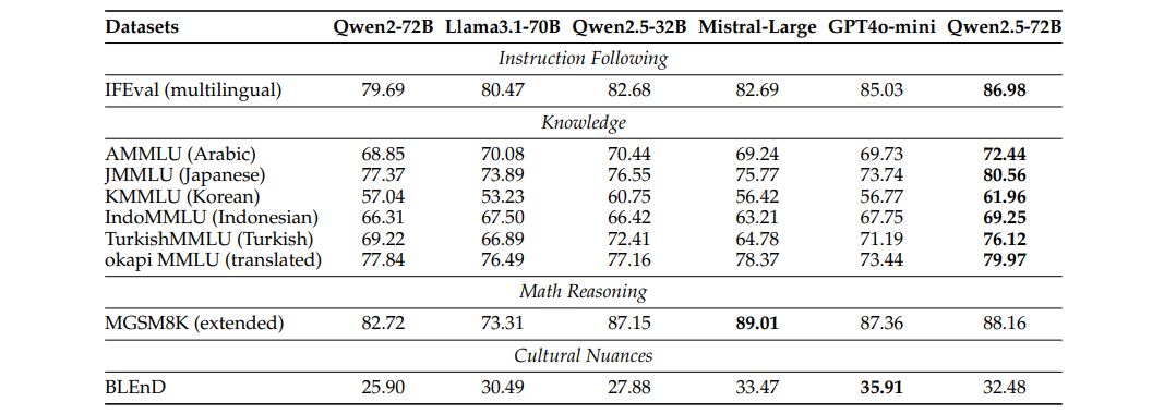 多语言评估 。为了全面评估指令调优模型的多语言能力,我们遵循P-MMEval(Zhang et al., 2024)的标准,并扩展了几个基准,具体如下:(1)IFEval(多语言) :我们将原本在英文中的IFEval基准扩展,包含了多语言的示例。为了确保语言中立性,我们去除了包含特定语言内容的实例(例如"以字母A开头")。(2)知识利用 :为了评估Qwen2.5系列模型在多语言中的知识利用能力,我们使用了五个类似MMLU的基准(多项选择格式)。这些基准包括:AMMLU(阿拉伯语)、JMMLU(日语)、KMMLU(韩语)、IndoMMLU(印尼语)和TurkishMMLU(土耳其语)。此外,我们还评估了模型在翻译版MMLU基准(okapi MMLU)上的表现。(3)MGSM8K(扩展版) :在原有 MGSM8K 基准的基础上,我们扩展了语言支持,包括阿拉伯语(ar)、韩语(ko)、葡萄牙语(pt)和越南语(vi)。(4)文化细微差异:为了评估模型捕捉文化细微差异的能力,我们使用了 BLEnD 基准(Myung et al., 2024)。该基准专门设计用于测试大语言模型(LLMs)对文化细微差异的理解。
