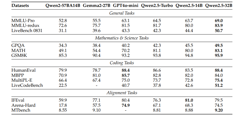 Qwen2.5-14B/32B-Instruct & Qwen2.5-Turbo。 对Qwen2.5-Turbo、Qwen2.5-14B-Instruct和Qwen2.5-32B-Instruct模型的评估,并与类似规模的基线模型进行比较。基线模型包括GPT4o-mini、Gemma2-27B-IT(Gemma Team et al., 2024)和Qwen2-57BA14B-Instruct(Yang et al., 2024a)。结果总结在表7中。Qwen2.5-32B-Instruct模型在大多数任务中表现优越,超越了类似规模的其他模型。特别是我们的开源Qwen2.5-14B-Instruct模型在所有基准测试中表现出色,甚至与GPT-4o-mini相抗衡。尽管训练和推理成本显著较低,Qwen2.5-Turbo模型在八项基准测试中超过了Qwen2.5-14B-Instruct。这证明Qwen2.5-Turbo在效率和效果方面都表现出色,是资源受限环境中的理想选择。