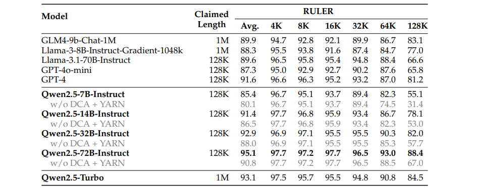 表 16:Qwen2.5 模型在 RULER 数据集上的性能,YARN+DCA 在 32K个 token 内并未改变模型的行为。