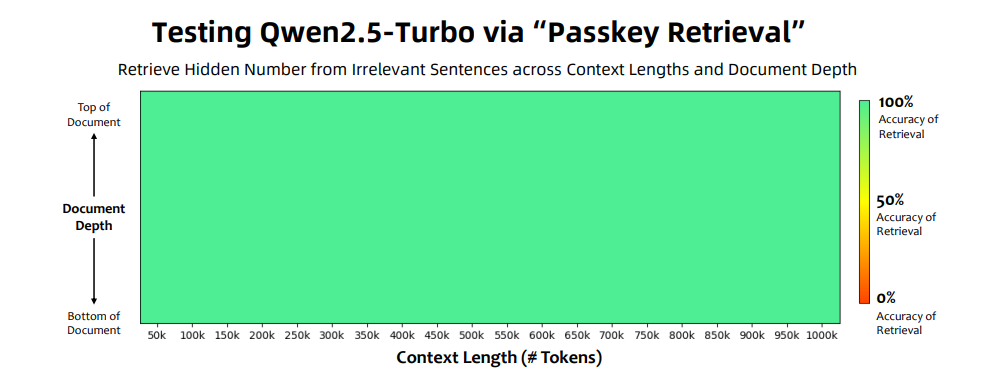 图 2:Qwen2.5-Turbo 在 100 万个令牌长度的密钥检索任务中的性能